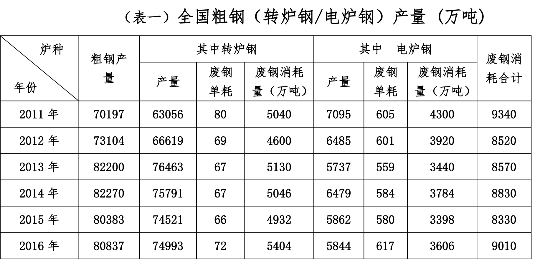 2016年全国钢产量8.0837亿吨,比2015年增加454万吨,增幅0.56%。共消耗废钢铁9010万吨,与2015年相比增加了680万吨,增幅为8.16%。其中:转炉消耗废钢5407万吨,占总消耗量60%,电炉消耗废钢3606万吨,占总消耗量40%。;废钢单耗111kg/t,比去年同期增加7kg/t,增幅6.73%。